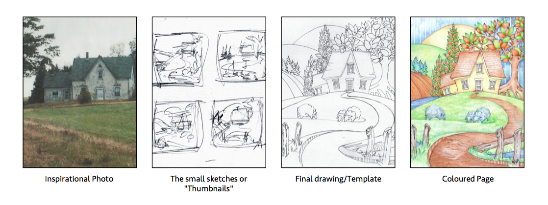 The objective of this course was to learn to dissect what makes a colouring page (or any other piece of art/design) 'work'. Then, taking inspiration from personal photographs, sketch up several quick thumbnails before honing the final sketch into a black & white template to be copied and used for colouring.